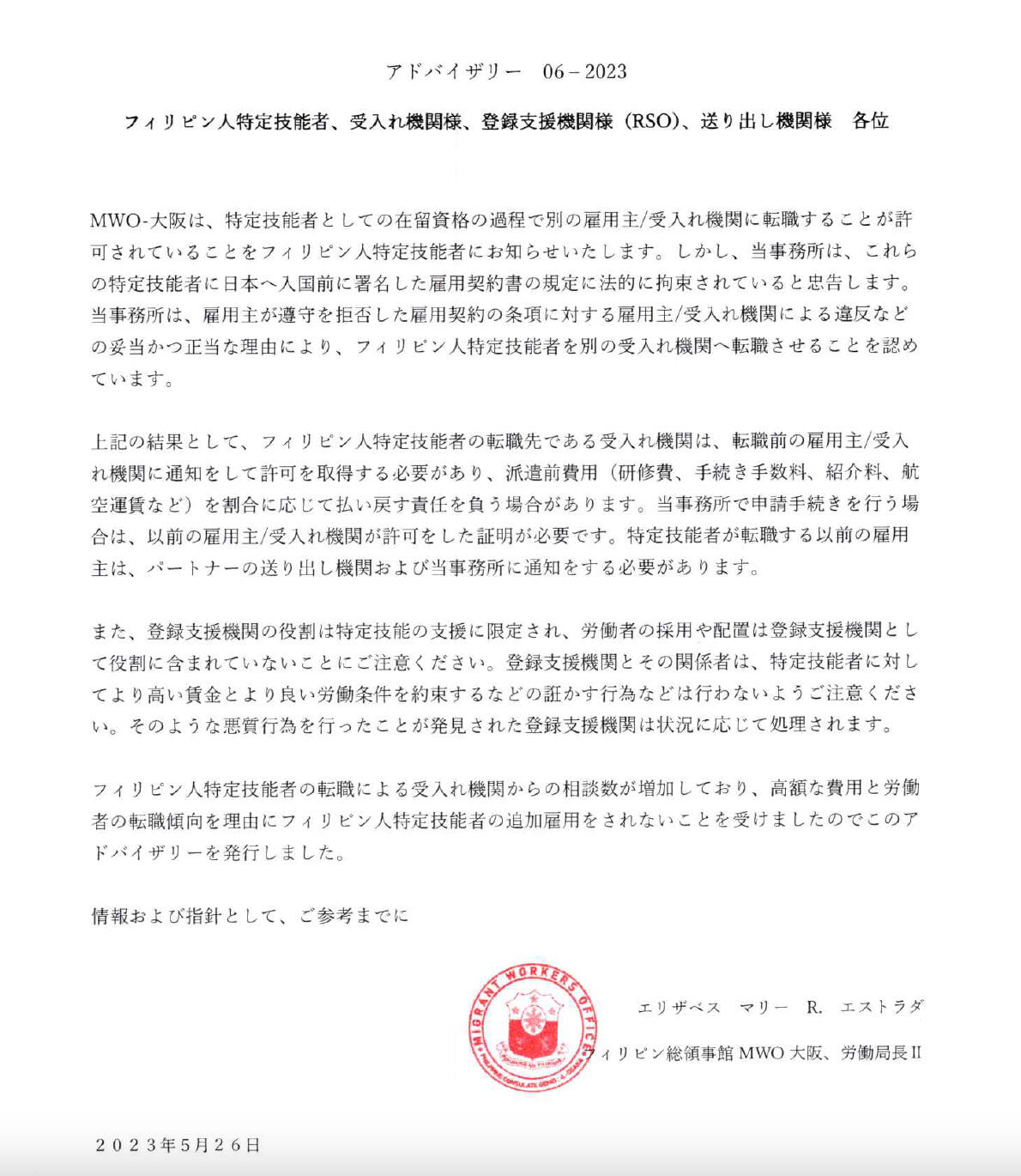 The Consulate General of the Philippines Osaka issued an advisory regarding the transfer of Filipino Specified Skilled Workers (SSWs) to new employers.Accepting organizations must secure clearance from the worker's previous employer and may be responsible for reimbursing pre-deployment expenses.